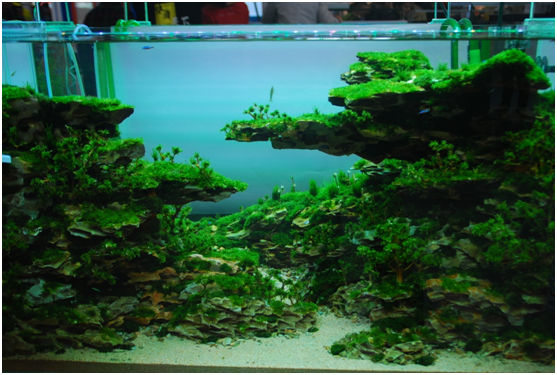 把層巒疊嶂的山峰搬進了缸里,再點綴上翠綠的水草, 這就是今年第二次在CIPS上舉辦的世界水草大師賽。水下造景為公認為是水下微縮園林,是目前正流行的休閑娛樂項目。本屆水草大師賽一共分為40組,共創作了40個水下微縮園林景觀。郎澤華是一位年輕的水景造型師,他的作品《 峭峰春榮》被評定為全場總冠軍。評委會對這件作品的點評是:缸中的石頭,按照由“近大遠小”原則,非常巧妙地組合在一起,營造出了很深的景深。同時,作者利用了很多的小素材,把很多細部做得非常的細致,尤其是前面的化妝紗鋪得很平整,讓人嘆為觀止。峭峰春榮 是一件用心、用智慧、用創意的偉大作品,是本次比賽當之無愧的全場總冠軍。
